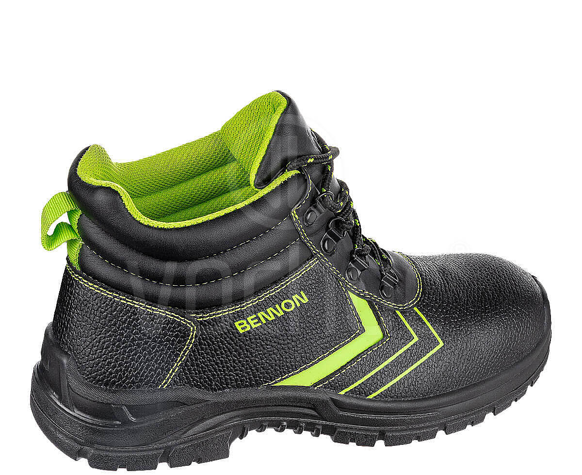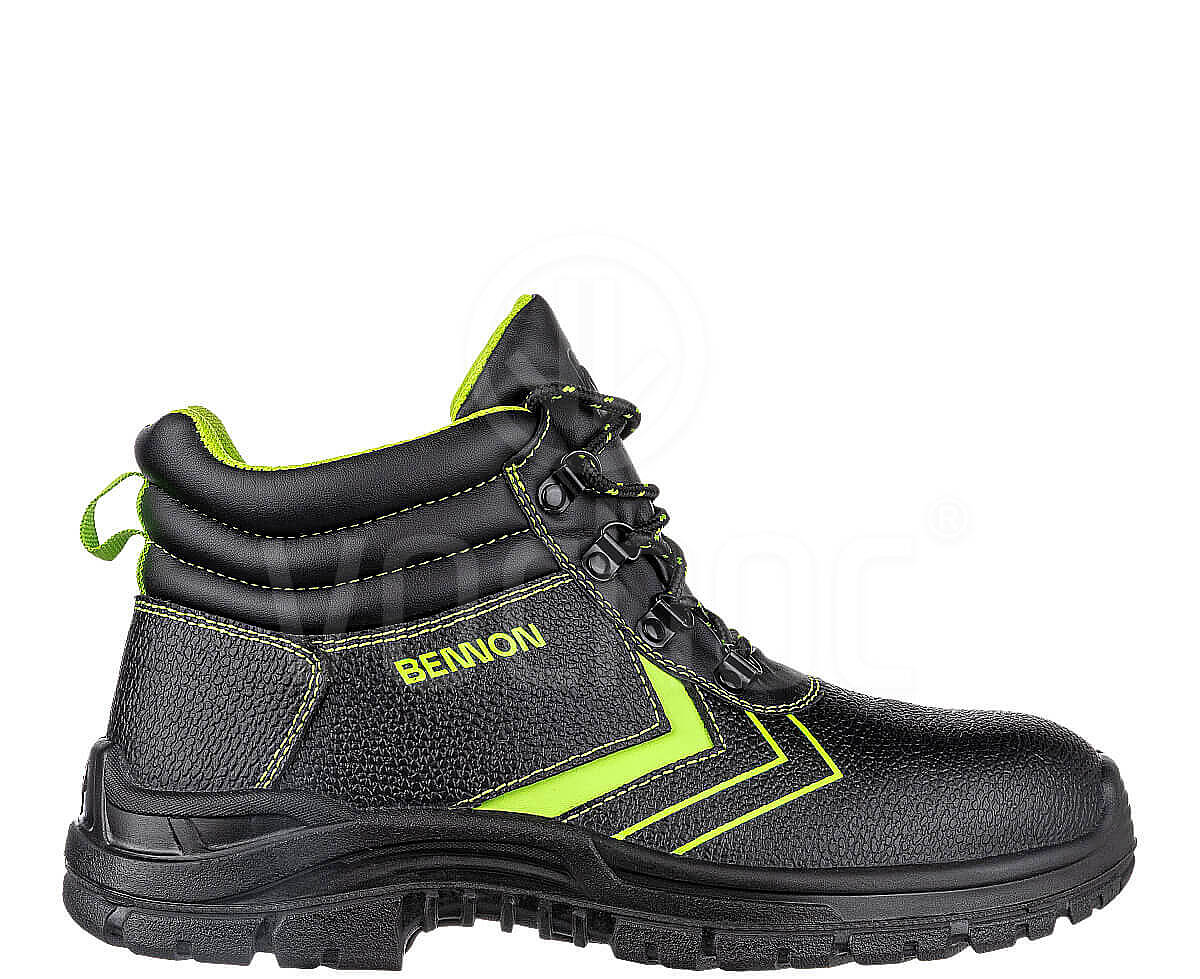 Obuv Bennon BASIC S3 HIGH, která obsahuje bezpečnostní ocelovou tužinku a planžetu.Tato dobře padnoucí bezpečnostní obuv je vyrobena na pohodlném (širokém) kopytě nachází univerzální využití v různých typech venkovních i vnitřních provozů. Svršek z hovězinové usně s hydrofobní úpravou odolávající působení vody. Stélka je anatomicky tvarovaná. Obuv splňuje požadavky kategorie S3 na uzavřenou patní část, antistatické vlastnosti, absorbci energie v oblasti paty, na průnik a absorbci vody, odolnost proti pohonným látkám, test pro práci na žebříku, odolnost vůči propíchnutí, podešev s dezénem.