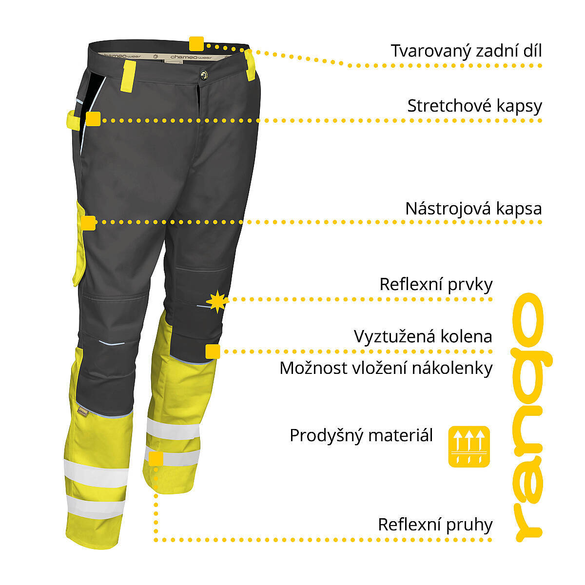 Pracovní oděvy RANGO a EVENTO značky CHAMEO Workwear® vynikají zejména perfektně padnoucím střihem, použitím jedinečných materiálů a splňují všechny požadavky moderních pracovních oděvů. Důraz je kladen především na vysoký podíl přírodních materiálů, vysokou odolnost a stálobarevnost materiálu, elasticitu a ergonomii oděvu. Reflexní doplňky zvyšují ochranu uživatele.