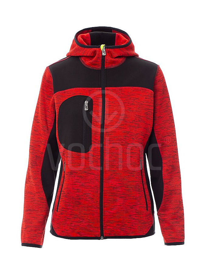 Dámská softshellová mikina, utěsněný celozip SBS, tvarovaná kapuce s dvojitým prošitím, tenký lem na zápěstí a v pase, dvě postranní kapsy na zip, jedna kapsa na hrudi. Úplet s vsadkami z černého softshellu.