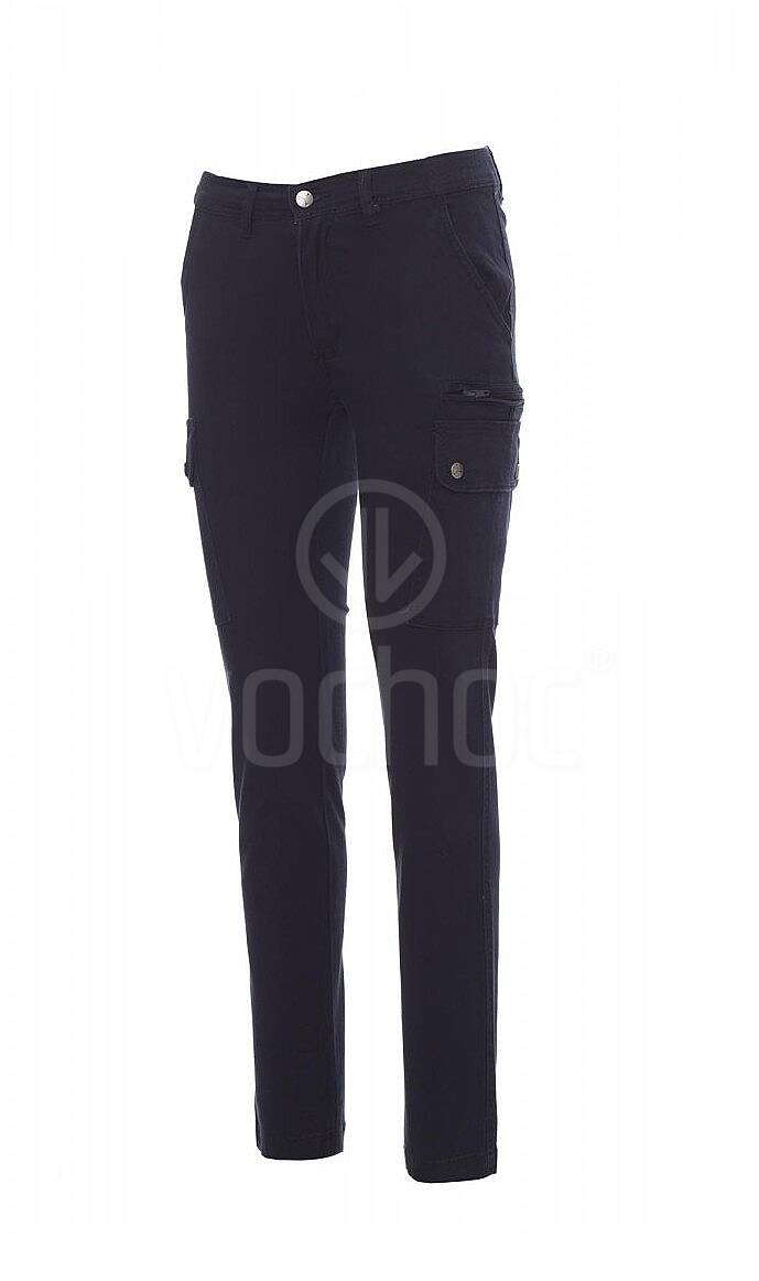 Dámské kalhoty klasického střihu, streč, celoroční, elastické pásky na bocích a poutka v pase, zapínání na zip a na kovový knoflík, dvě přední kapsy klasicého střihu, dvě postranní kapsy s klopou a druky, jedna kapsa na zip po levé straně, skrytá kapsa na svinovací metr po pravé straně, dvě zadní prostřižené kapsy s knoflíkovou dírkou a knoflíkem.