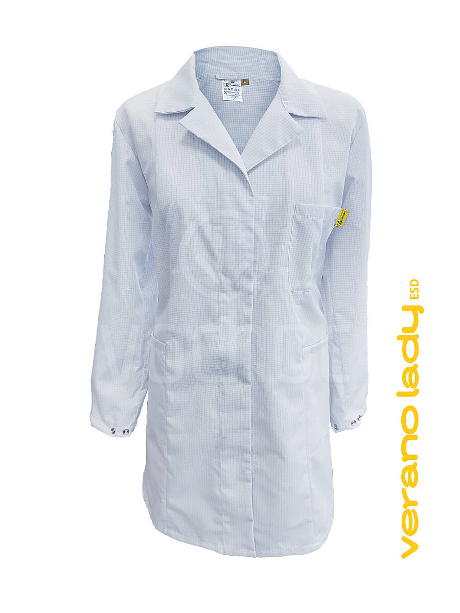 ESD plášť 3/4 délky v dámském střihu, provedení v bílé barvě. Zapínání pláště na druky, rukávy se zapínáním na druky. Plášť má 2 boční kapsy a 1 náprsní kapsu, s poutkem na zavěšení. Dostupný také v šedé a navy provedení.