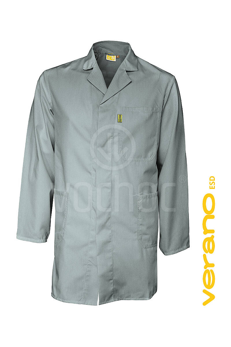 ESD plášť 3/4 délky, provedení v šedé barvě. Zapínání pláště na druky, rukávy se zapínáním na druky. Plášť má 2 boční kapsy a 1 náprsní kapsu, s poutkem na zavěšení. Dostupný také v bílé a navy barvě.