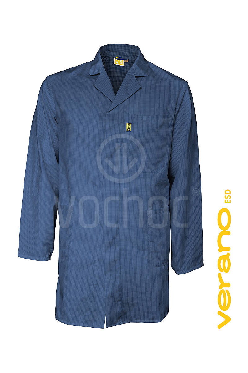 ESD plášť 3/4 délky, provedení v barvě navy. Zapínání pláště na druky, rukávy se zapínáním na druky. Plášť má 2 boční kapsy a 1 náprsní kapsu, s poutkem na zavěšení. Dostupný také v bílé a šedé barvě.