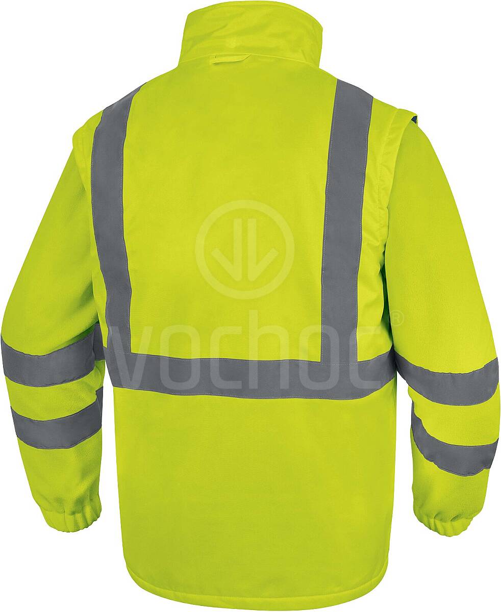 Bunda je vyrobena z plně vodotěsného a větruodolného materiálu, který spolehlivě ochrání před deštěm, chladem i větrem. Součástí je vyšší límec pro lepší ochranu krku a odnímatelné rukávy, díky nimž lze bundu snadno přeměnit na praktickou vestu. Termoizolační vrstva zajišťuje tepelný komfort i při nízkých teplotách. Vysokou viditelnost zaručují výrazné barvy a retroreflexní pásky, které splňují požadavky na bezpečnost při práci. Materiál je zároveň šetrný k pokožce a splňuje standard Oeko-Tex.