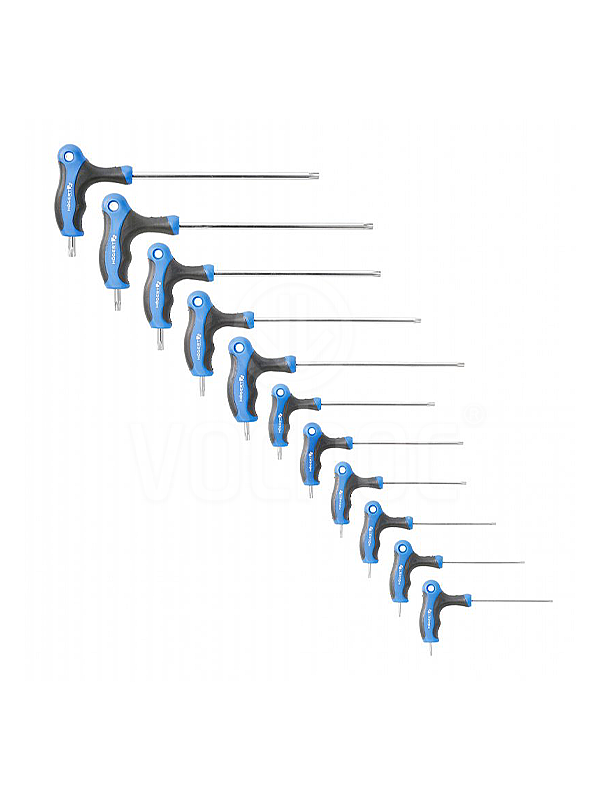 10 dílná sada přesných, dlouhých klíčů torx security vyrobených z legované oceli S2 nejvyšší kvality, která zaručuje maximální pevnost a odolnost proti deformacím a zkroucení. Použití držáku ve tvaru písmene „T“ zajišťuje pohodlí během používání a také pevné uchopení. Skvěle se osvědčí při povolování a dotahování šroubů ve stísněných prostorech. Klíče jsou nepostradatelné při práci v dílně, na stavbě, při opravách nebo v každé domácnosti. Sada obsahuje klíče o velikostech T8, T9, T10, T15,T20, T25, T27, T30, T40 a T45.